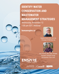 Join BOMA Canada for the 6th session in the Enspire Your Building: Education Series on Water Conservation and Wastewater Management. Learn from industry experts Sam Thomas (Prism Engineering) and Stephen Dixon (TdS Dixon Inc.) on how water, wastewater, and energy management are interconnected, explore cost-saving strategies, and how to spot valuable heat recovery opportunities.