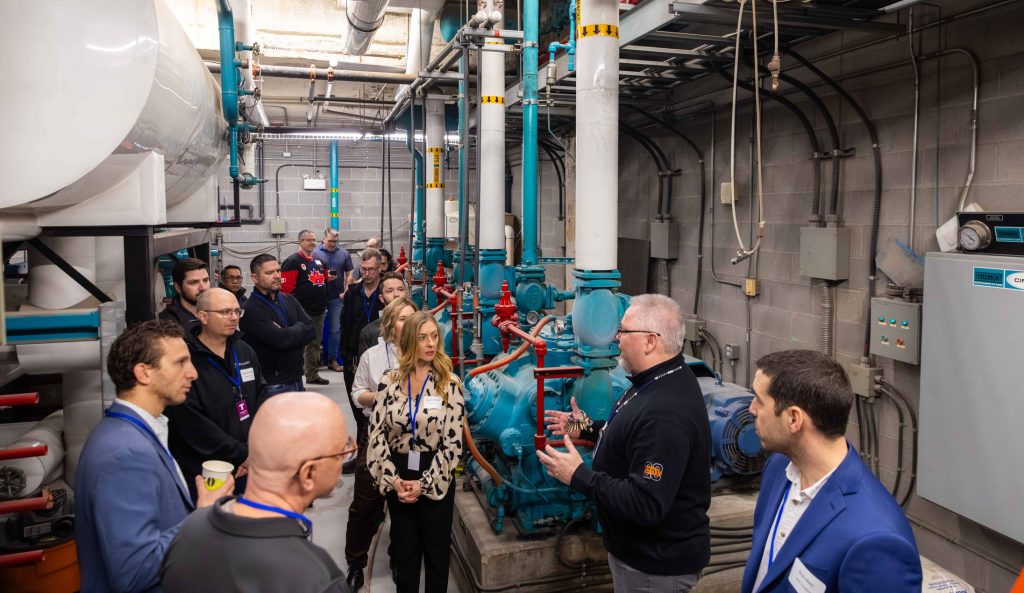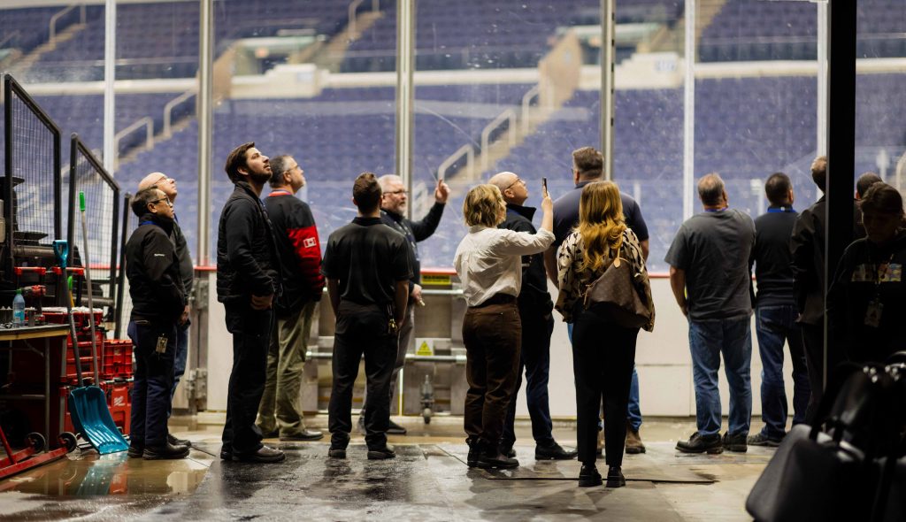 For 30 power engineers and building operations staff, Neubauer and Senior Engineer & Ice Technician Jared Sinninghe generously served as tour guides. After breakfast in the Alumni Lounge, the group got an up-close look at the building’s ice plant room, boiler room, main electrical vault, operations control room, upper press box, and, of course, the arena bowl with that renowned ice surface.